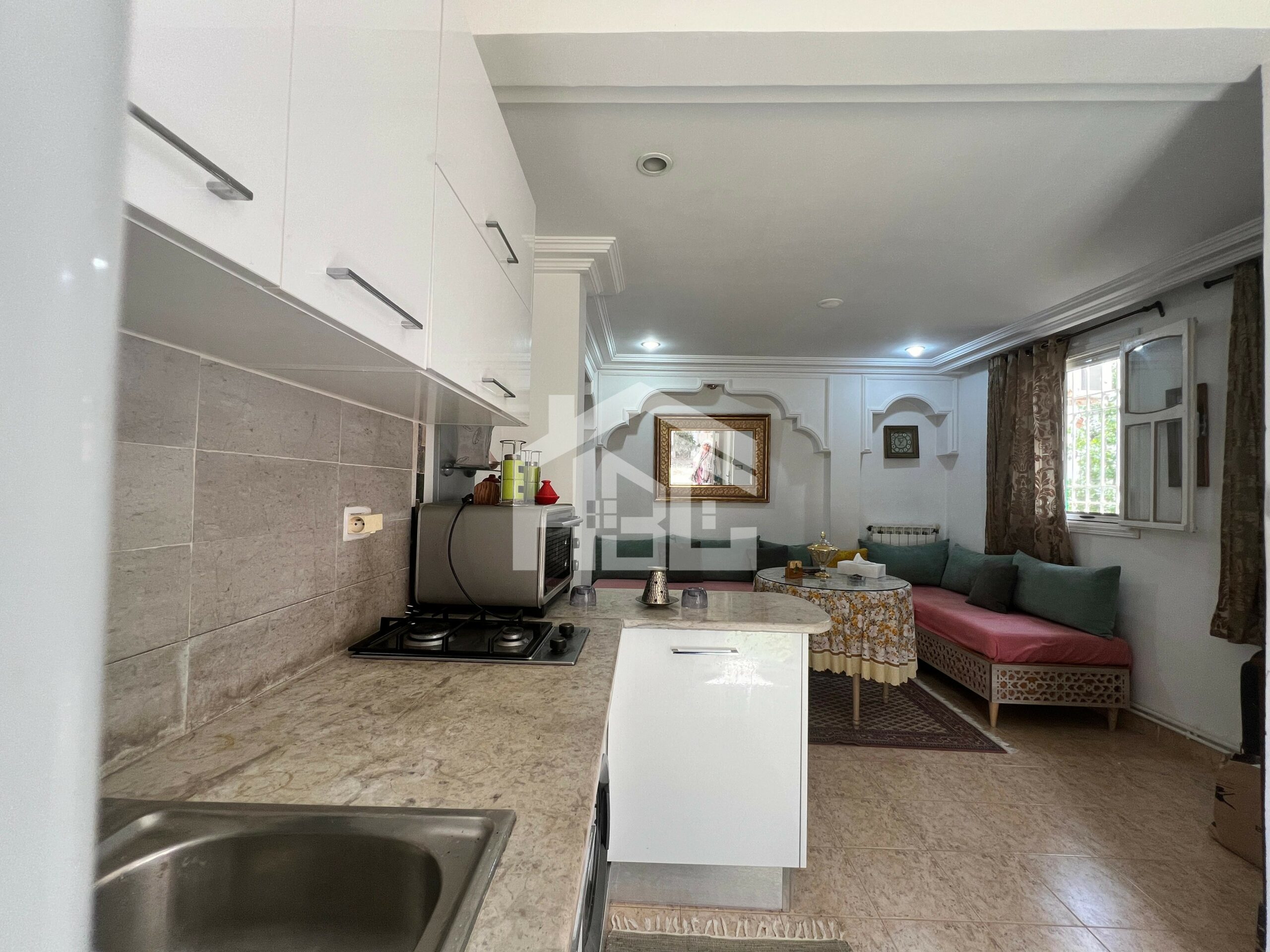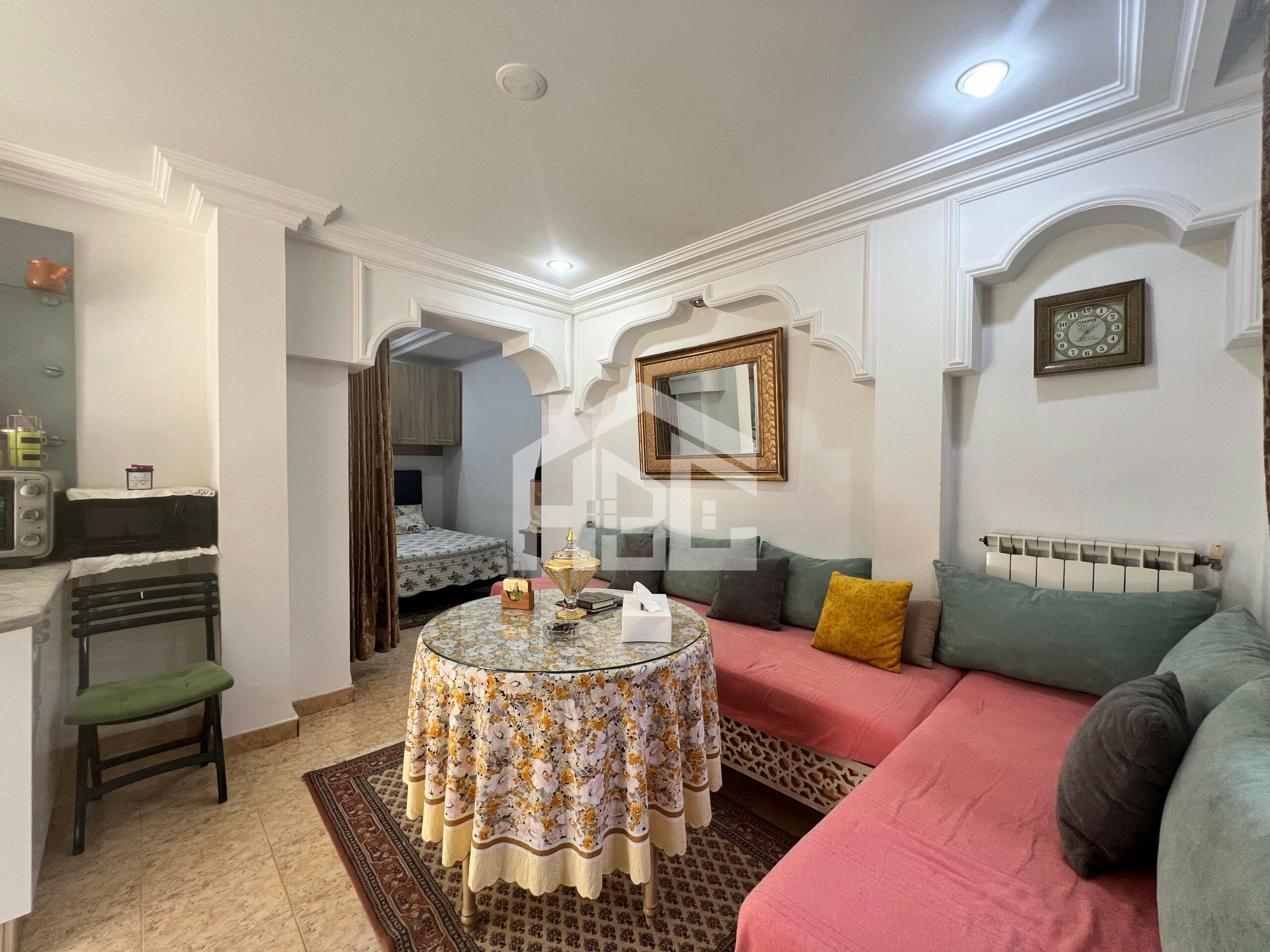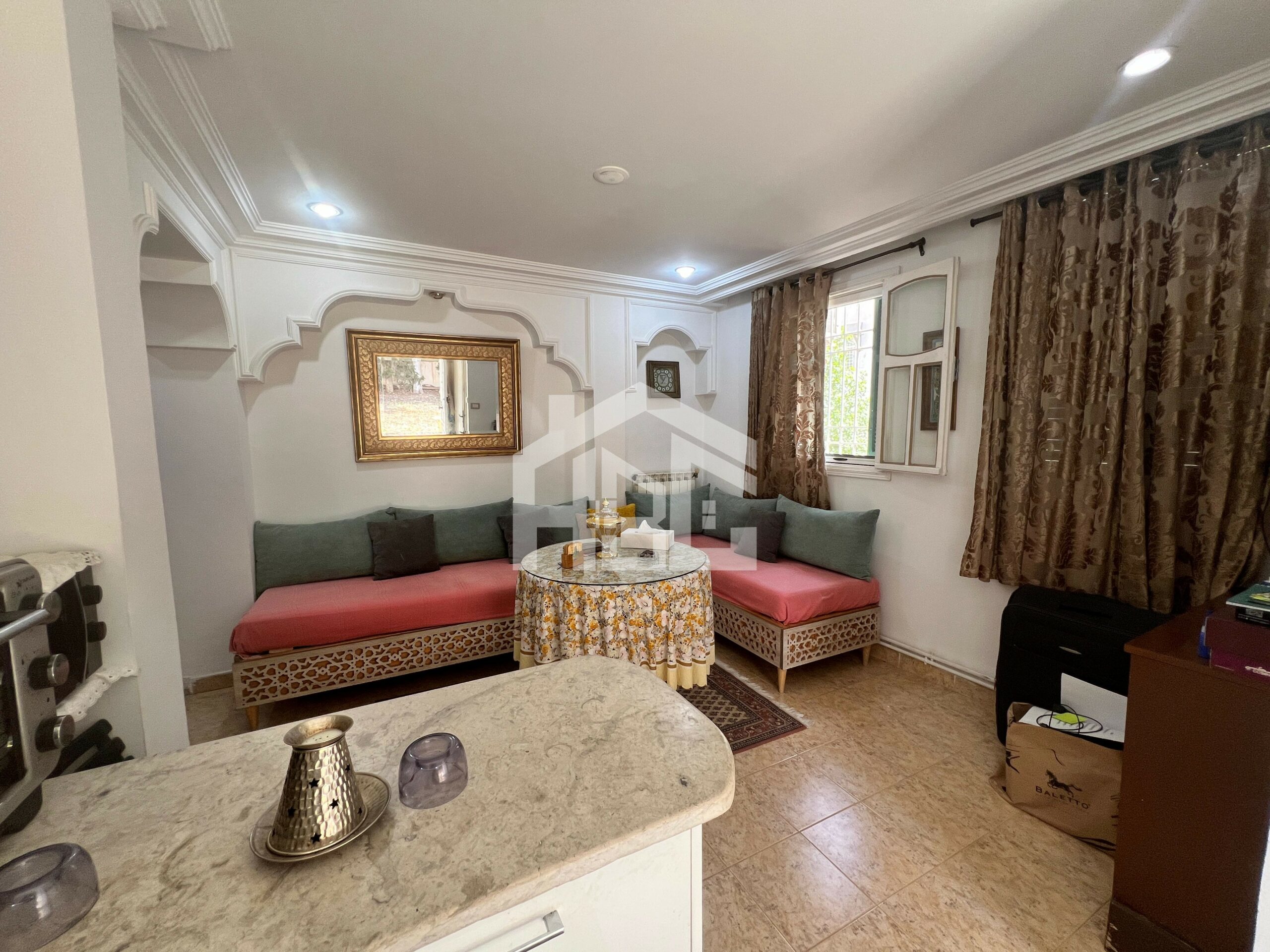 L’entrée donne sur un salon lumineux baigné de lumière naturelle grâce à large fenêtre orientés plein sud aménagé par un salon arabesque, une table basse et une plasma, la décoration harmonieuse apporte une touche d’élégance à l’ensemble.