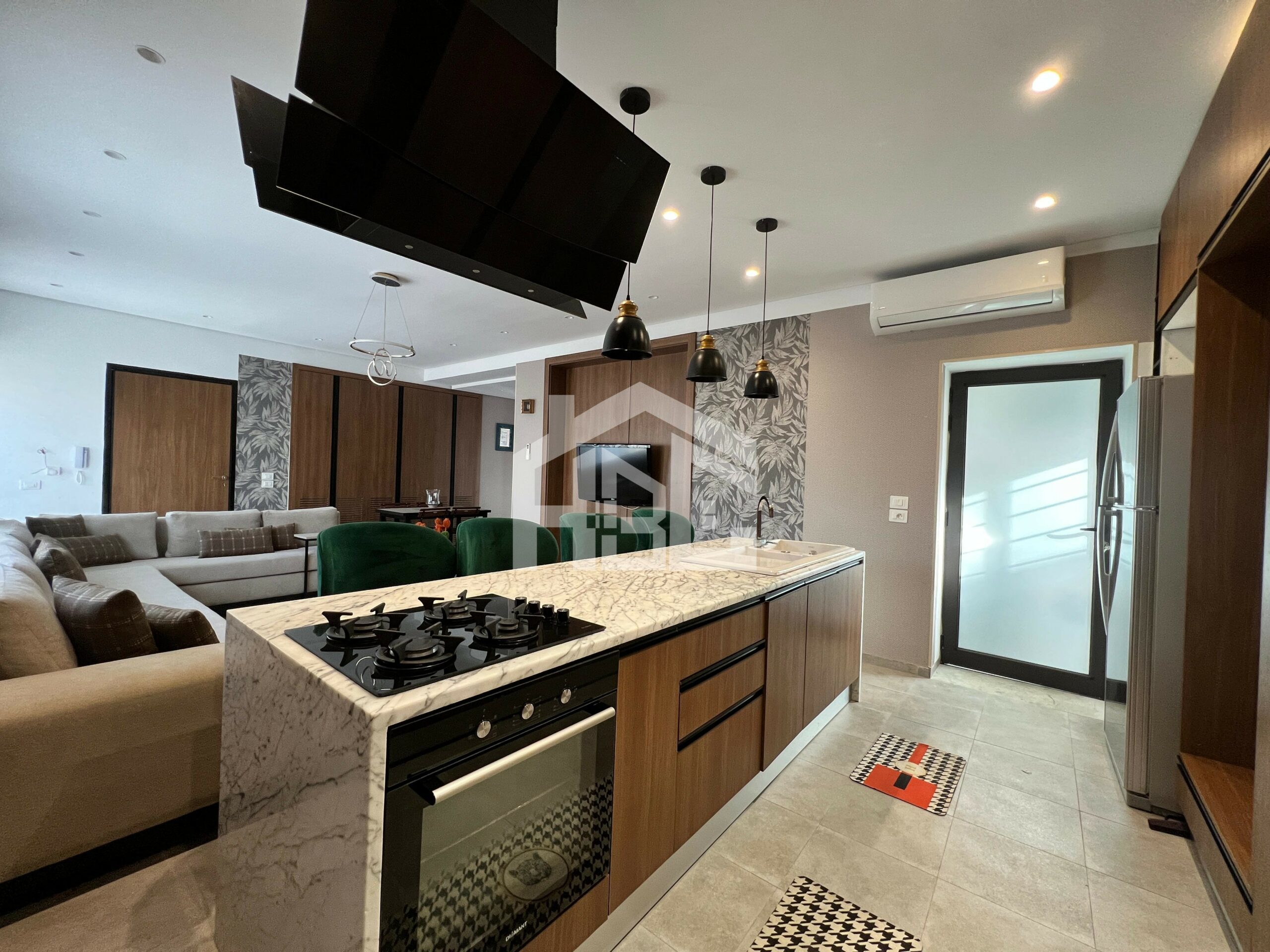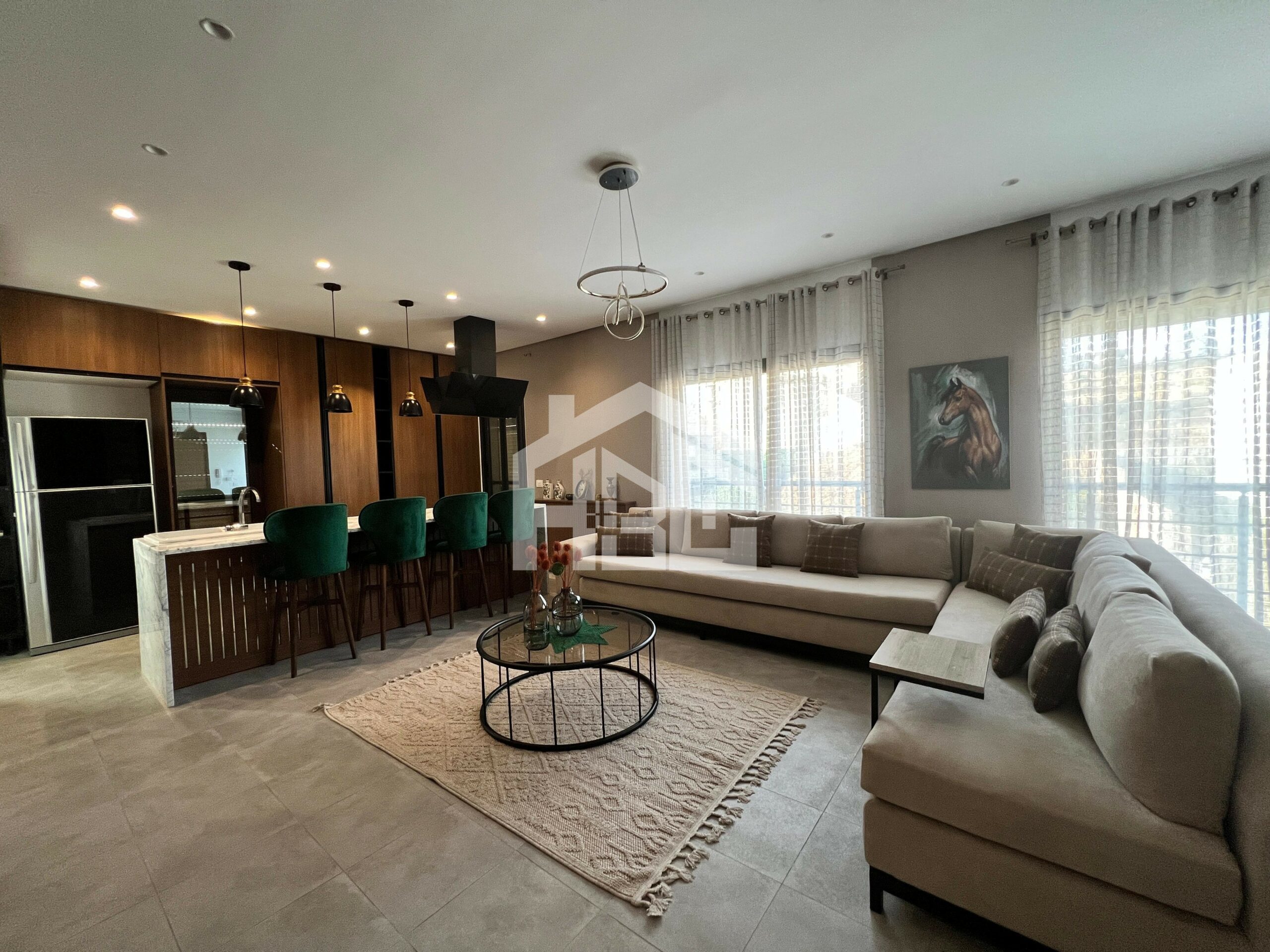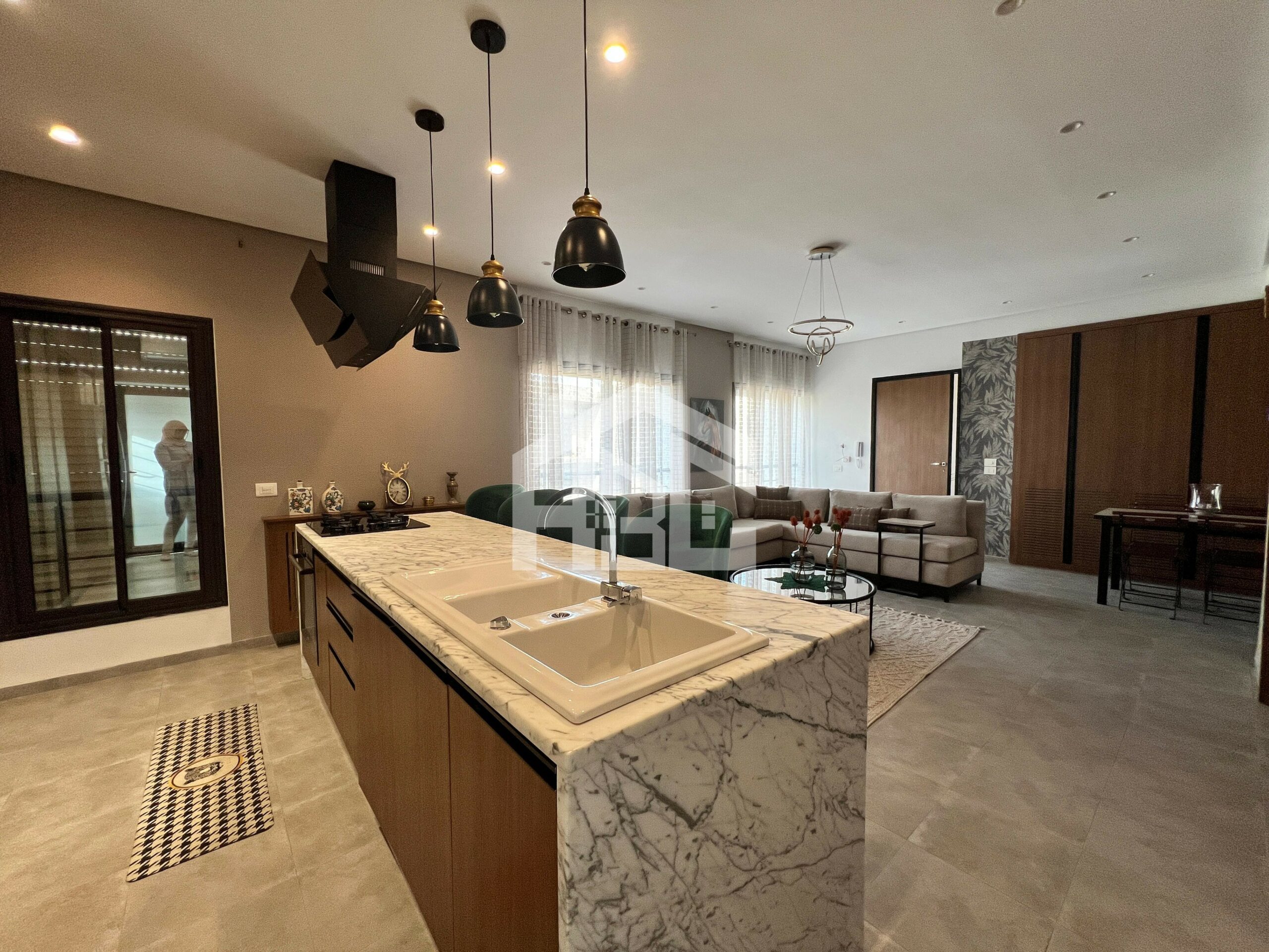 Dès l’entrée vous êtes accueilli sur un salon lumineux offrant une atmosphère chaleureuse. Grâce à sa conception open-space, il s’ouvre harmonieusement sur une cuisine américaine avec îlot central de très haut standing, totalement aménagée avec des matériaux nobles et design contemporain et équipée par un four électrique, une hotte aspirante une plaque de cuisson et un réfrigérateur annexée par un séchoir aménagé par une deuxième cuisine équipée par une plaque de cuisson, une hotte aspirante et une machine à laver pour plus de fonctionnalité.