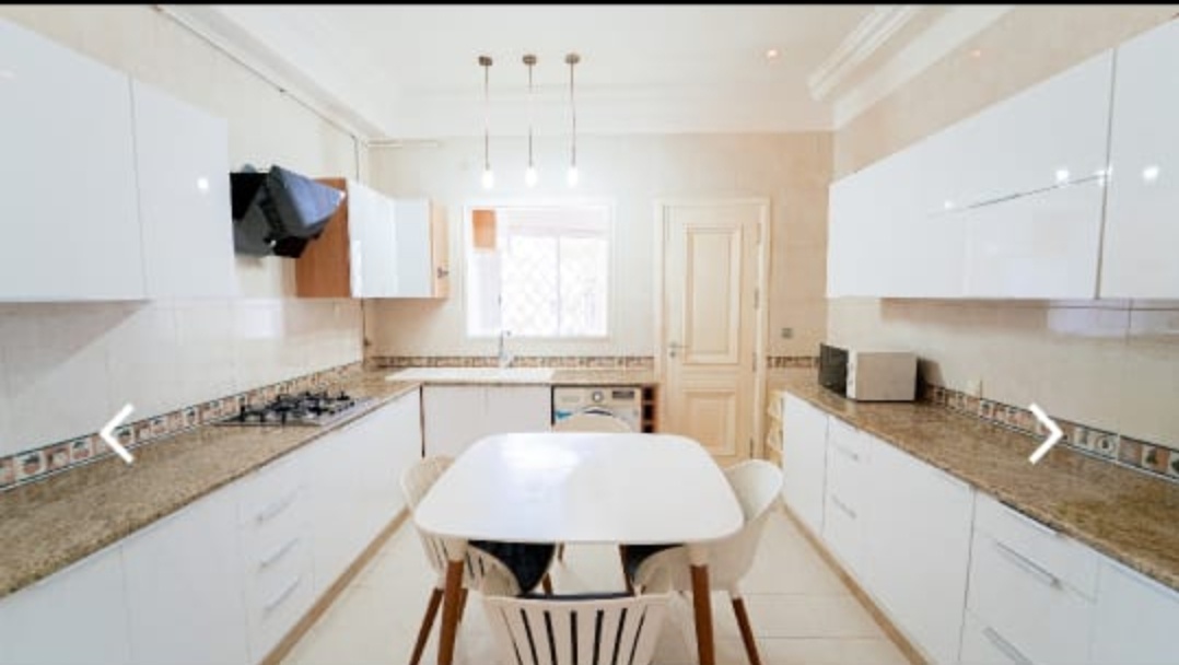 La cuisine est totalement aménagée et équipée par un four électrique, une hotte aspirante, une plaque de cuisson, un réfrigérateur, une micro-onde, une lave-vaisselle, une lave linge et les petits électroménager annexée par un séchoir pour plus de fonctionnalité.