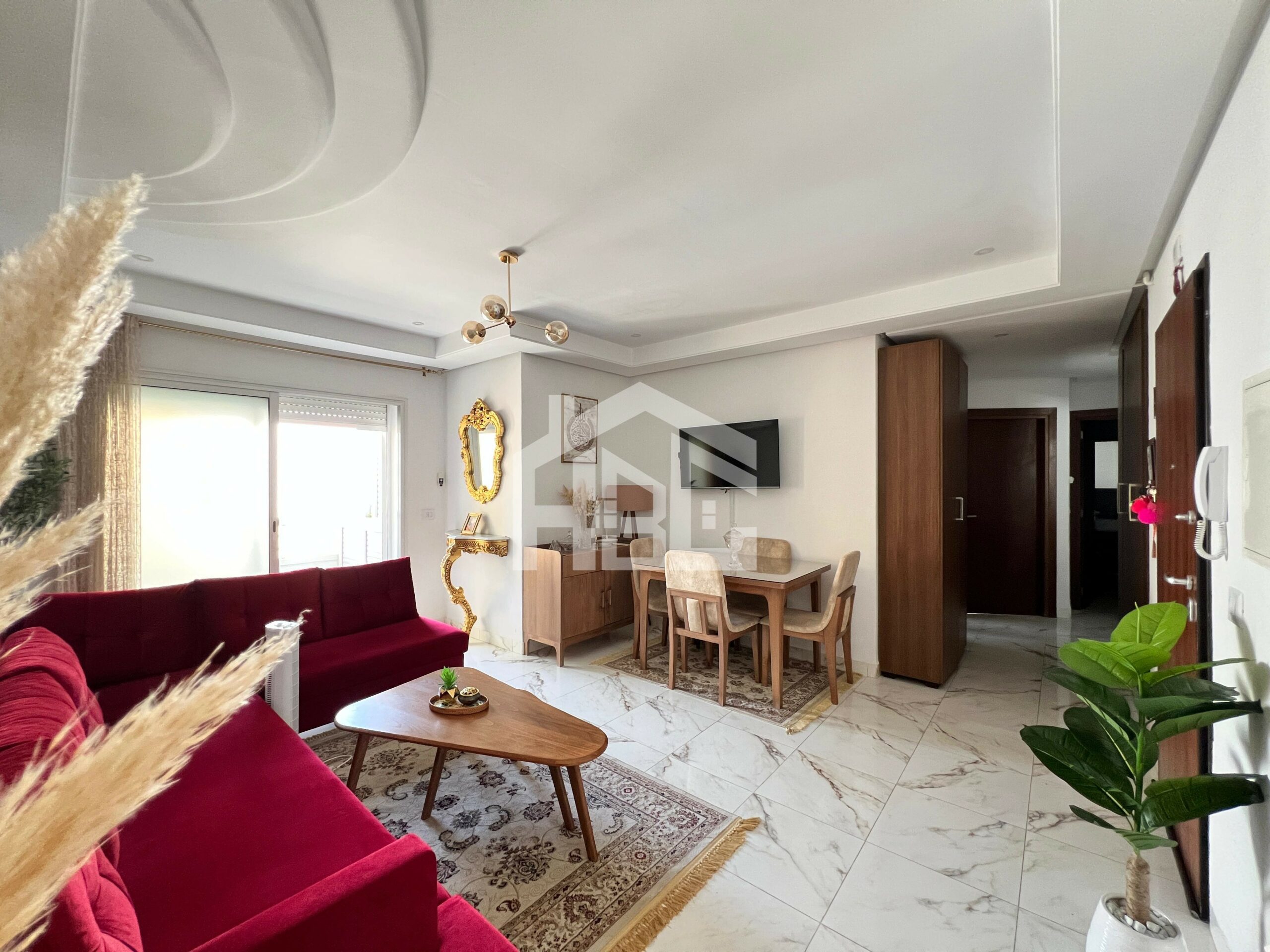 L’entrée donne sur un spacieux salon tapissé en marbre blanc et baigné de lumière naturelle grâce à sa baie vitrée qui donne sur un balcon.
