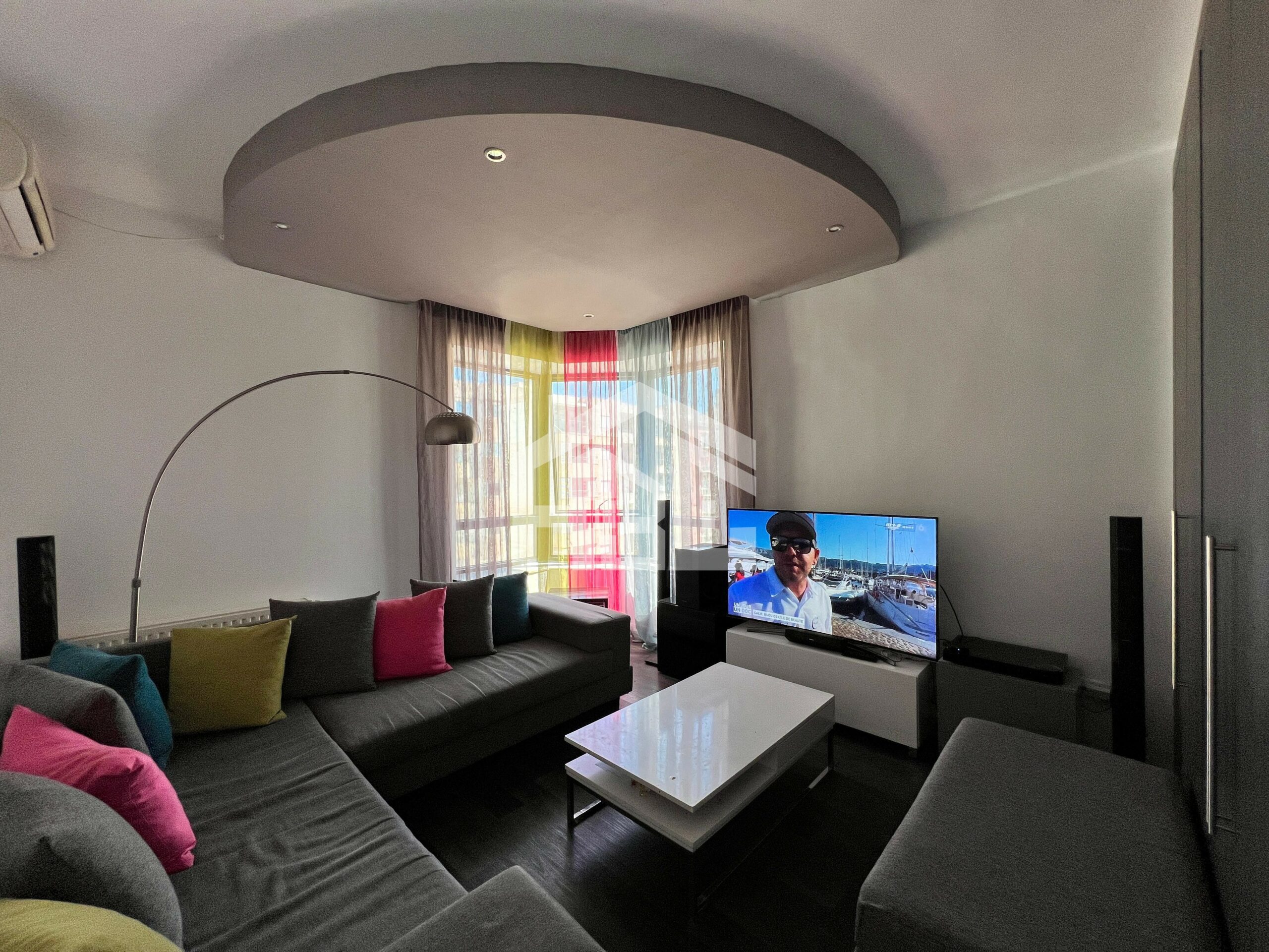 L’entrée donne sur un vaste salon séduit par son élégance et son agencement moderne baigné de lumière naturelle grâce à de grande baie vitrée qui offre une vue dégagée sur l’extérieur. Le sol est tapissé de marbre blanc, apporte une touche de raffinement et de modernité à l’espace. Les murs aux tons neutres mettent en valeur la brillance du marbre et permettent une grande liberté de décoration.