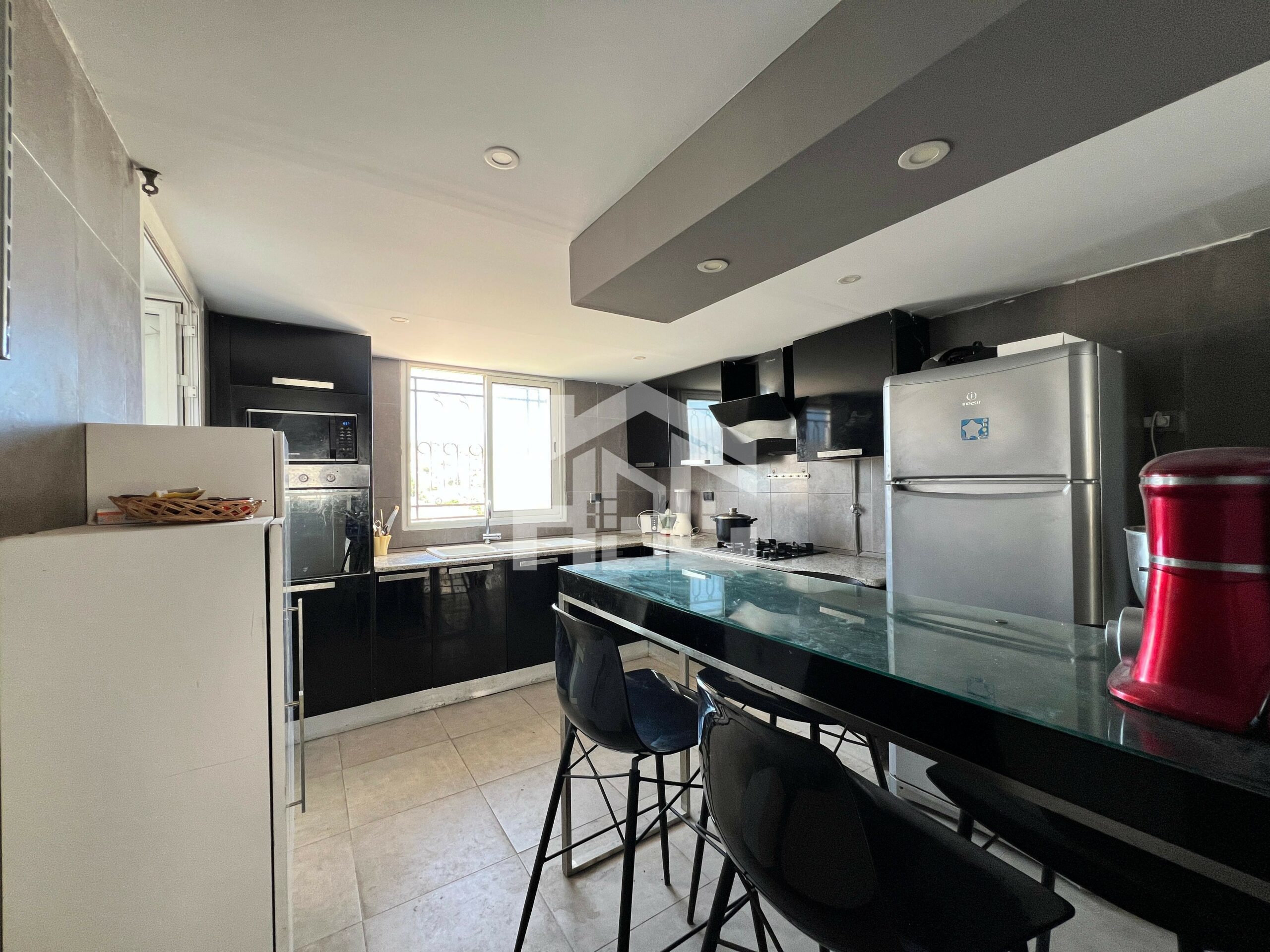 Ouverte sur le salon, la cuisine au design épuré s’intègre harmonieusement dans l’ensemble. Elle est totalement aménagée et équipée par un four électrique, une hotte aspirante, une plaque de cuisson et une micro-onde annexée par séchoir pour plus de fonctionnalité.