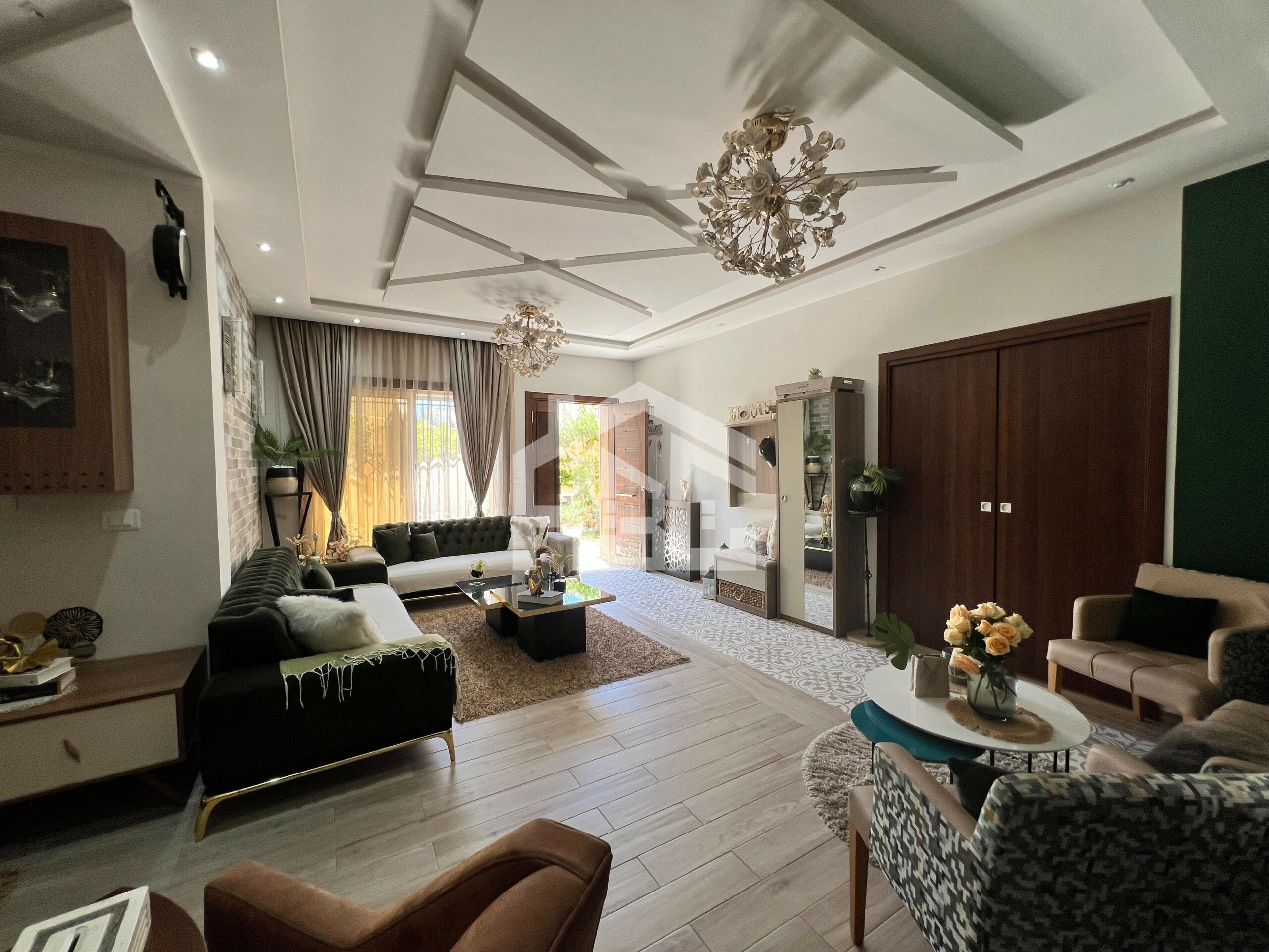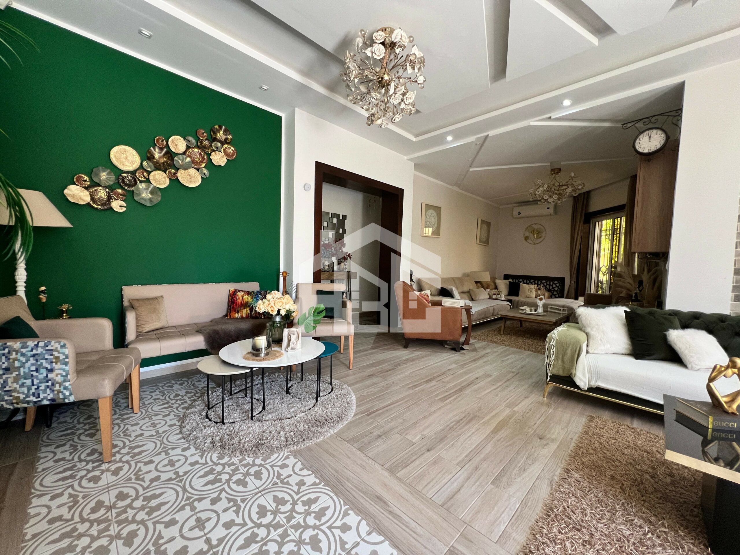 L’entrée donne sur un spacieux salon baigné de lumière naturelle grâce à de larges baies vitrées, il s’ouvre directement sur le jardin offrant une belle continuité entre l’intérieur et l’extérieur.