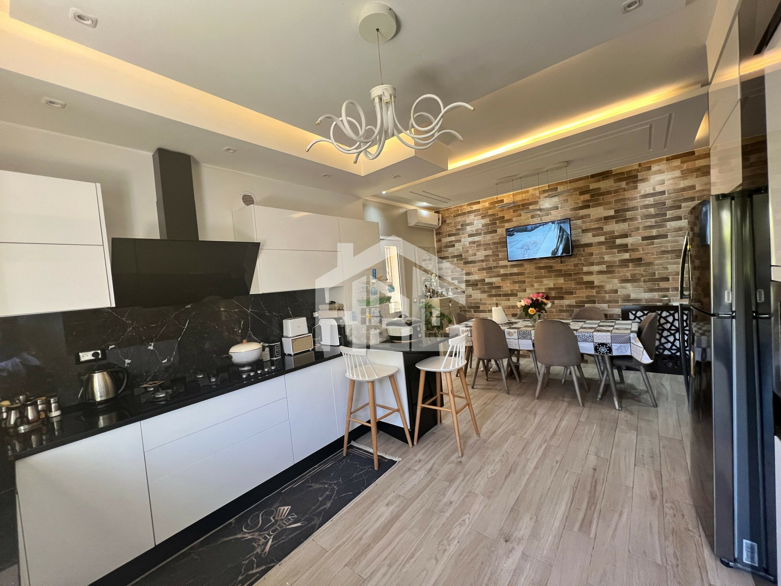 La cuisine est totalement aménagée et équipée par un four électrique, une hotte aspirante, une plaque de cuisson et une lave vaisselle. Elle dispose de nombreux rangements, de plans de travail spacieux et d’un agencement ergonomique. Les matériaux de qualité, les finitions soignée et l’électroménager intégré ajoutent une touche contemporaine à cet espace clé de la maison.
