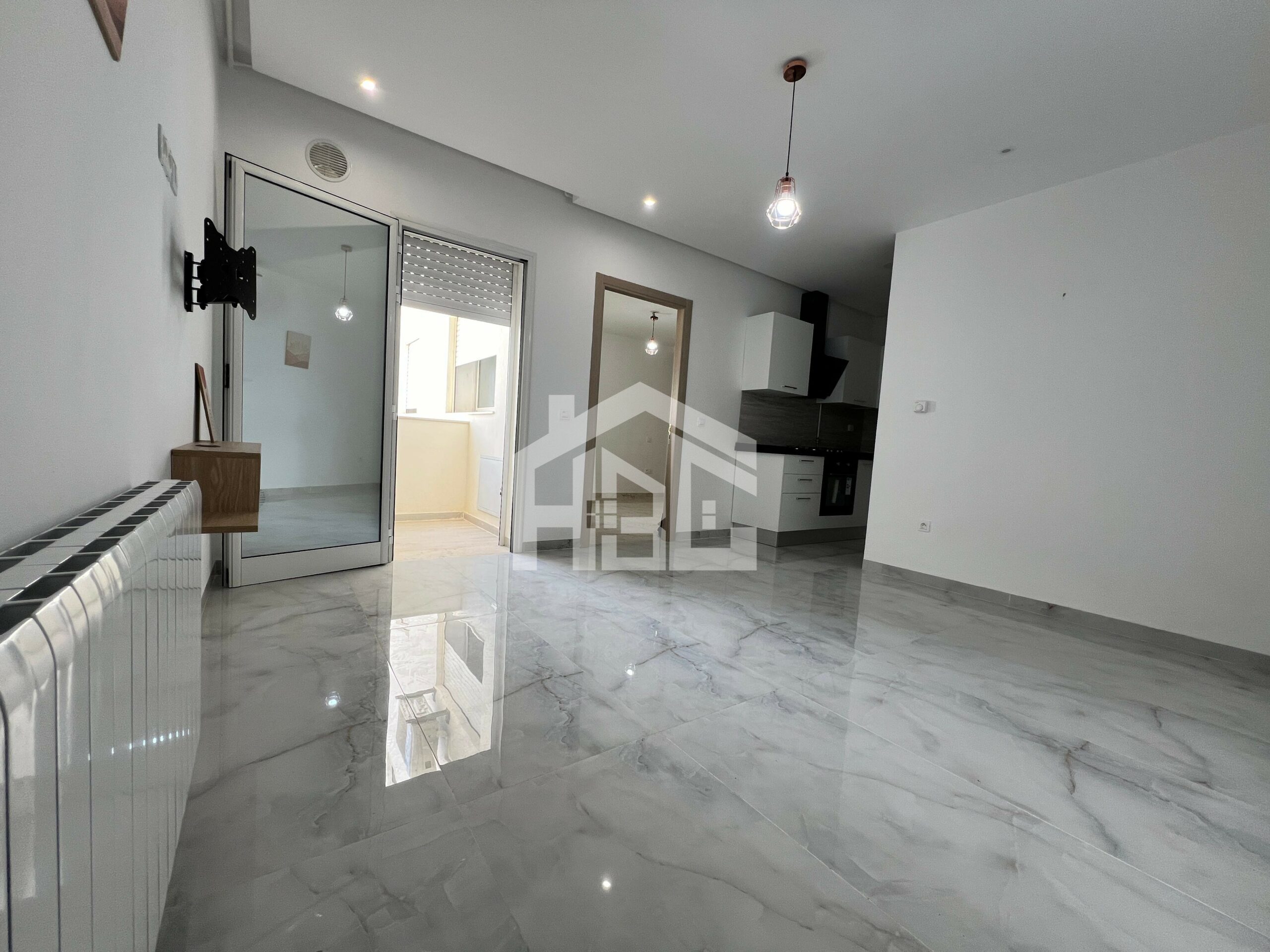 L’entrée donne sur un petit couloir qui vous mène vers un salon lumineux grâce à sa baie vitrée qui donne sur le balcon.