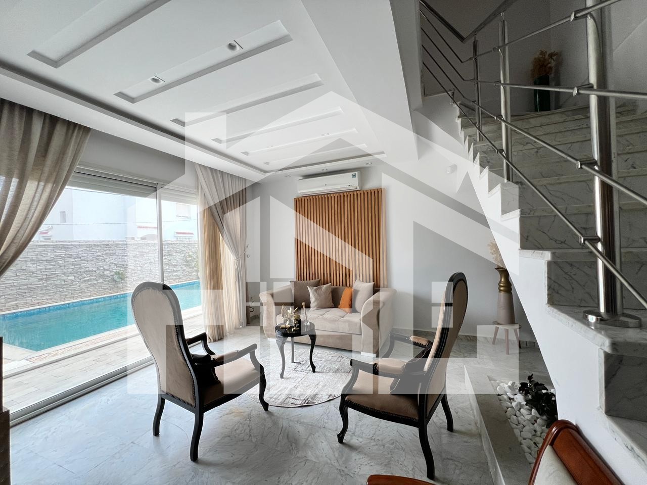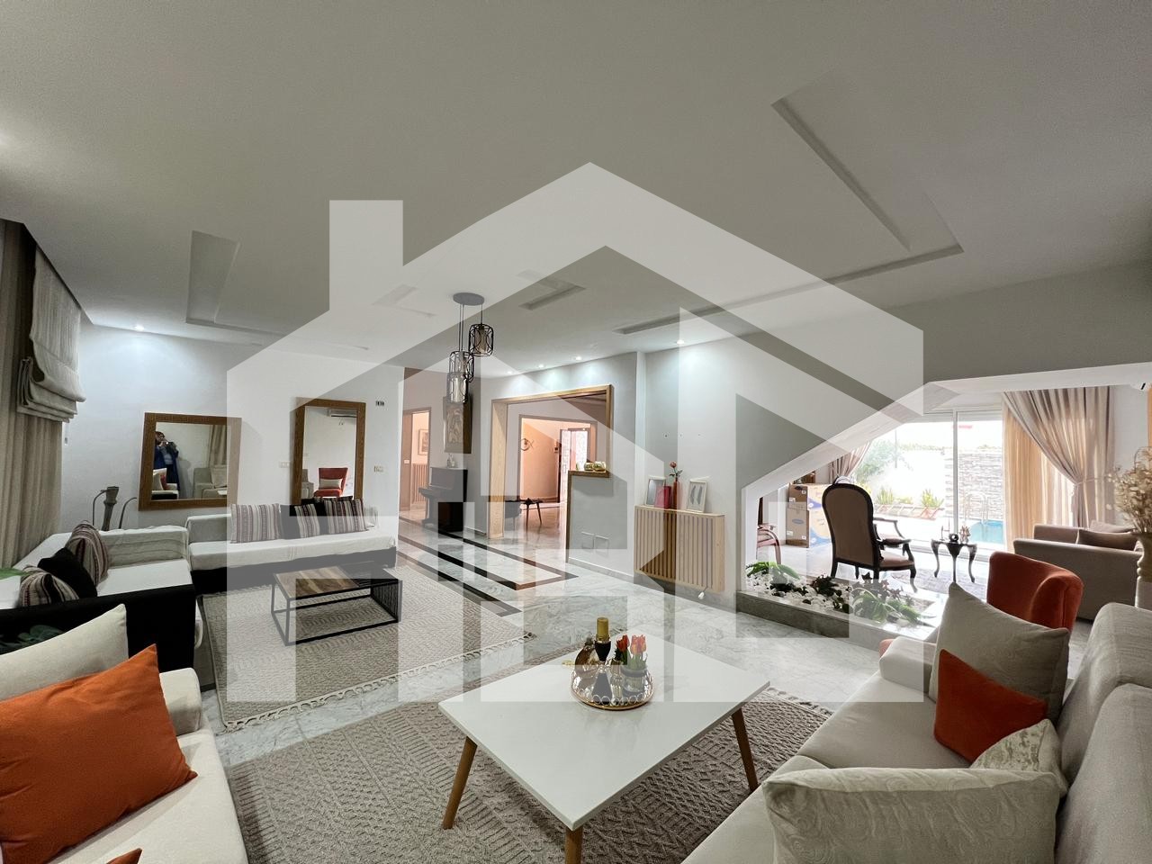 Le salon de presque 100 m² vous accueil avec des volumes exceptionnels et une luminosité remarquable. Grâce à ses larges ouvertures, il offre une vue dégagée et un accès direct sur la piscine, créant une parfaite continuité entre les espaces intérieurs et extérieurs. Cet espace de réception généreux permet d’aménager aisément deux salons distincts ainsi qu’une salle à manger, idéal pour recevoir dans un cadre à la fois convivial et raffiné.
